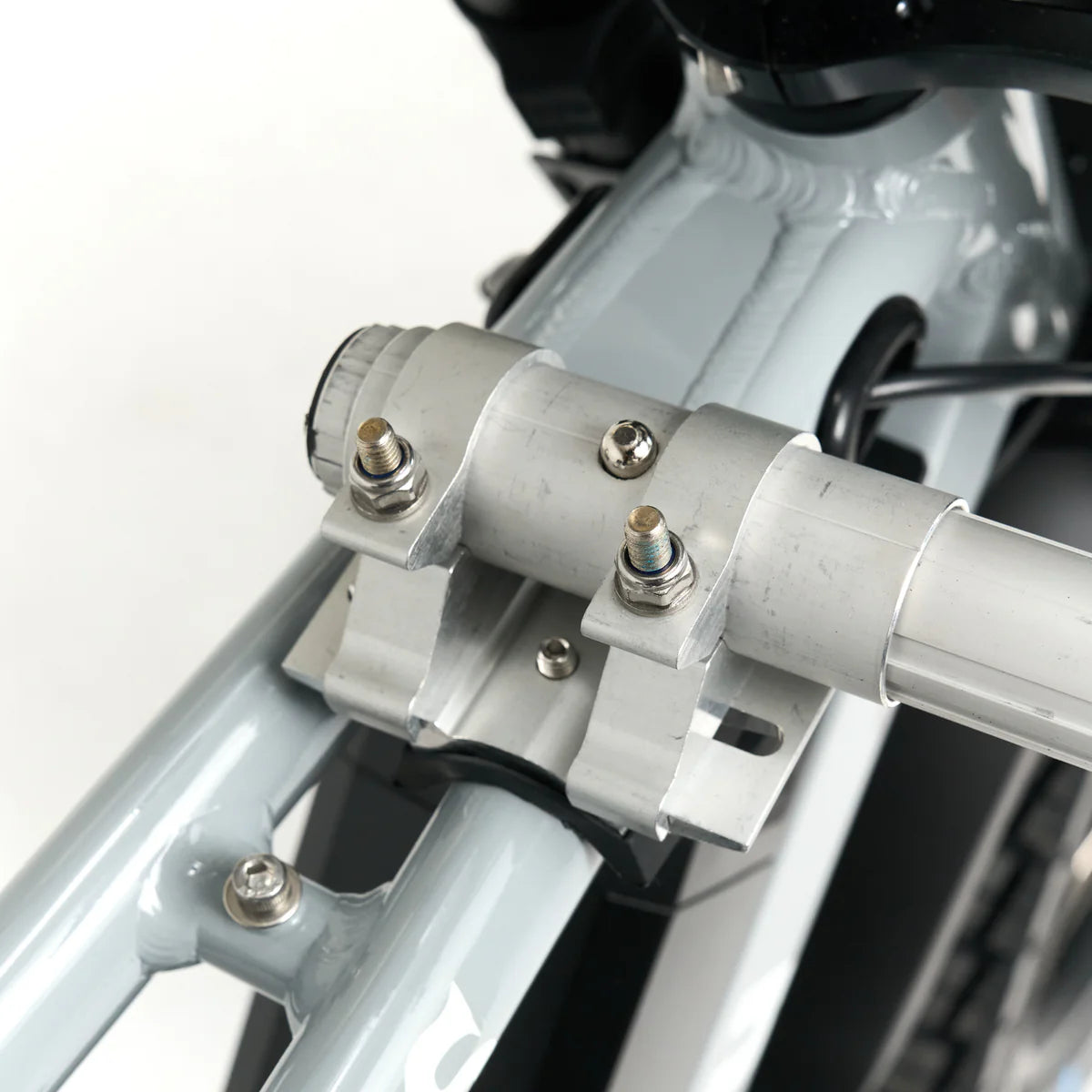 The perfect longboard surf rack for your Fatboy Electric Bike. Easy to mount and dismount to the rear rack of the Fatboy eBike. Customised to suit the Harlem, Scrambler and the Bagus models of ebike. Suitable for 7 ft-9 ft Surf Boards.